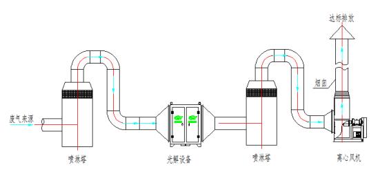 制藥廢氣處理考慮運(yùn)營成本及安全性,本方案工藝路線擬定采用“通風(fēng)系統(tǒng)(風(fēng)機(jī)、收集罩、管道)+預(yù)處理系統(tǒng)(水洗塔)+核心凈化系統(tǒng)(UV光解凈化設(shè)備)+后處理系統(tǒng)(堿淋塔)”來進(jìn)行制藥廢氣處理。工藝設(shè)備圖如下: