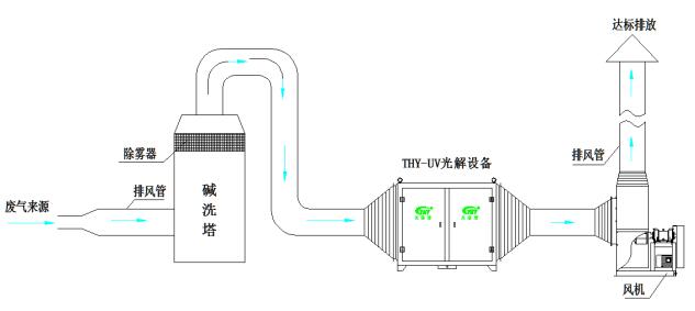 垃圾臭氣處理考慮運營成本及安全性,工藝采用以“通風系統(管道、引風機)+核心凈化系統(噴淋塔+UV光解凈化設備)”為核心工藝來處理垃圾臭氣工藝設備圖如下: