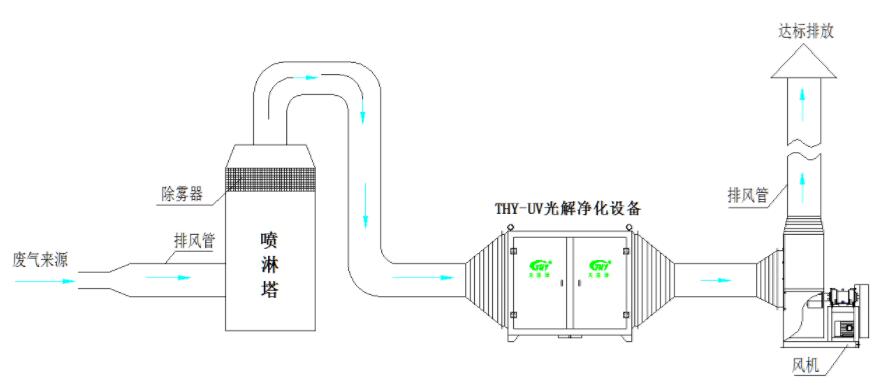 第一階段:廢氣經(jīng)過一級水噴淋對廢氣中氨、醇等易溶于水的成分以及灰塵進行去除預(yù)處理,再進入下一道工序。